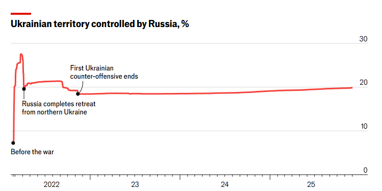 În ultimii trei ani, Rusia a capturat doar 1,45% din teritoriul Ucrainei, care găzduiește aproximativ aceeași proporție din populația sa dinaintea invaziei. Și niciun oraș mare nu a ajuns în mâinile Rusiei.