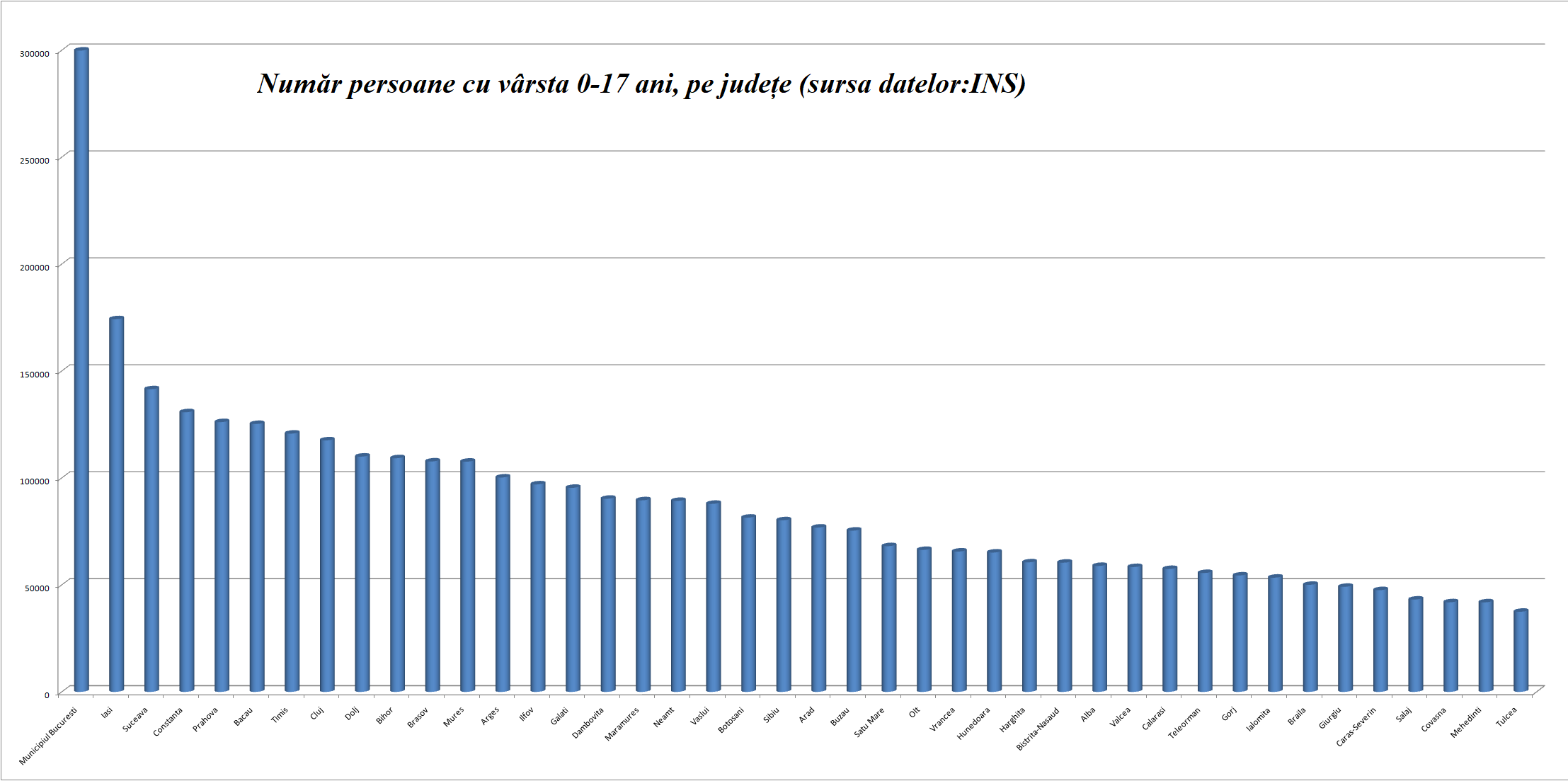 Cei mai mulți copii sunt în Capitală (atât ca pondere în numărul total al copiilor, câr și în cifre absolute), București fiind urmat de județele Iași, Constanța, Suceava și Prahova, potrivit calculelor HotNews.ro (luând în calcul populați cu cel mult 17 ani împliniți din cadrul populației rezidente).