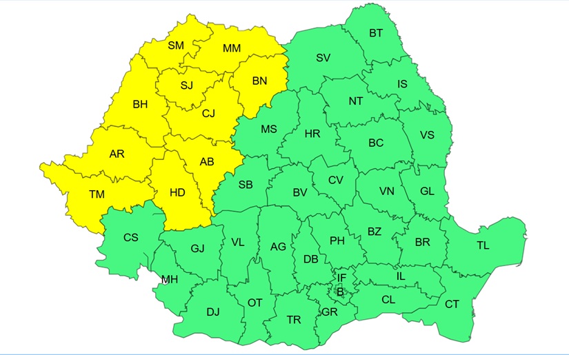 Atenționarea meteorologică intră în vigoare la ora 12 și vizează județele Bistrița-Năsăud, Maramureș, Satu Mare, Sălaj, Cluj, Bihor, Alba, Arad, Hunedoara și Timișoara.