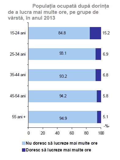 - In anul 2013, circa 638.000 persoane (6,9% din populatia ocupata), doreau sa lucreze cu program de lucru mai lung (numar mai mare de ore) decat in prezent, la acelasi loc de munca sau la un altul; 79,0% dintre aceste persoane locuiau in mediul rural, 61,9% erau de sex masculin, iar 29,5% apartineau grupei de varsta 35-44 ani. Din totalul persoanelor care doreau sa lucreze mai multe ore, doar 9,5% au cautat un alt loc de munca; dintre acestea, 68,5% erau barbati, 68,4% locuiau in mediul rural si 56,6% aveau varste intre 25-44 ani.