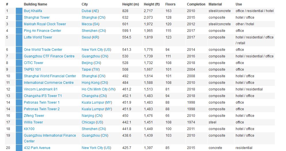 Dacă luăm în calcul clădiri și mai înalte, adică cele de peste 300 de metri, Dubai este pe primul loc, cu 22 de super-structuri, la Shenzen sunt 11, în Guangzhou sunt 10, în New York opt și în Hong Kong și Chicago, șase.