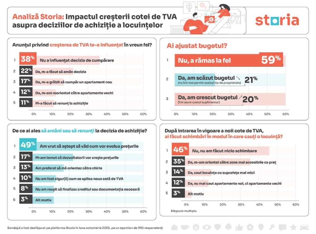 Schimbările fiscale anunțate pentru luna august au influențat deciziile celor care erau în procesul de căutare și achiziție. Astfel, 22% dintre cei aflați în căutarea unui apartament au ales să amâne achiziția, în timp ce 17% au declarat că s-au grăbit să finalizeze tranzacția pentru a putea beneficia – în funcție de valoarea locuinței și de condițiile legale – de una dintre cele două cote de TVA (9% sau 19%). Cel mai recent sondaj realizat de platforma imobiliară Storia, în octombrie 2025, s-a adresat persoanelor aflate în căutarea unei locuințe noi sau celor care nu erau încă decise cu privire la tipul de locuință pe care îl caută și care începuseră procesul de căutare înainte de iulie 2025. Întrebați dacă odată cu intrarea în vigoare a noii cote de TVA au făcut schimbări în modul în care caută o locuință, cei mai mulți dintre respondenți au menționat că nu au făcut nicio schimbare (46%). Totuși 35% au declarat că s-au orientat către zone mai accesibile ca preț, 14% caută locuințe cu suprafețe mai mici și 12% nu mai caută apartamente noi, ci vechi.