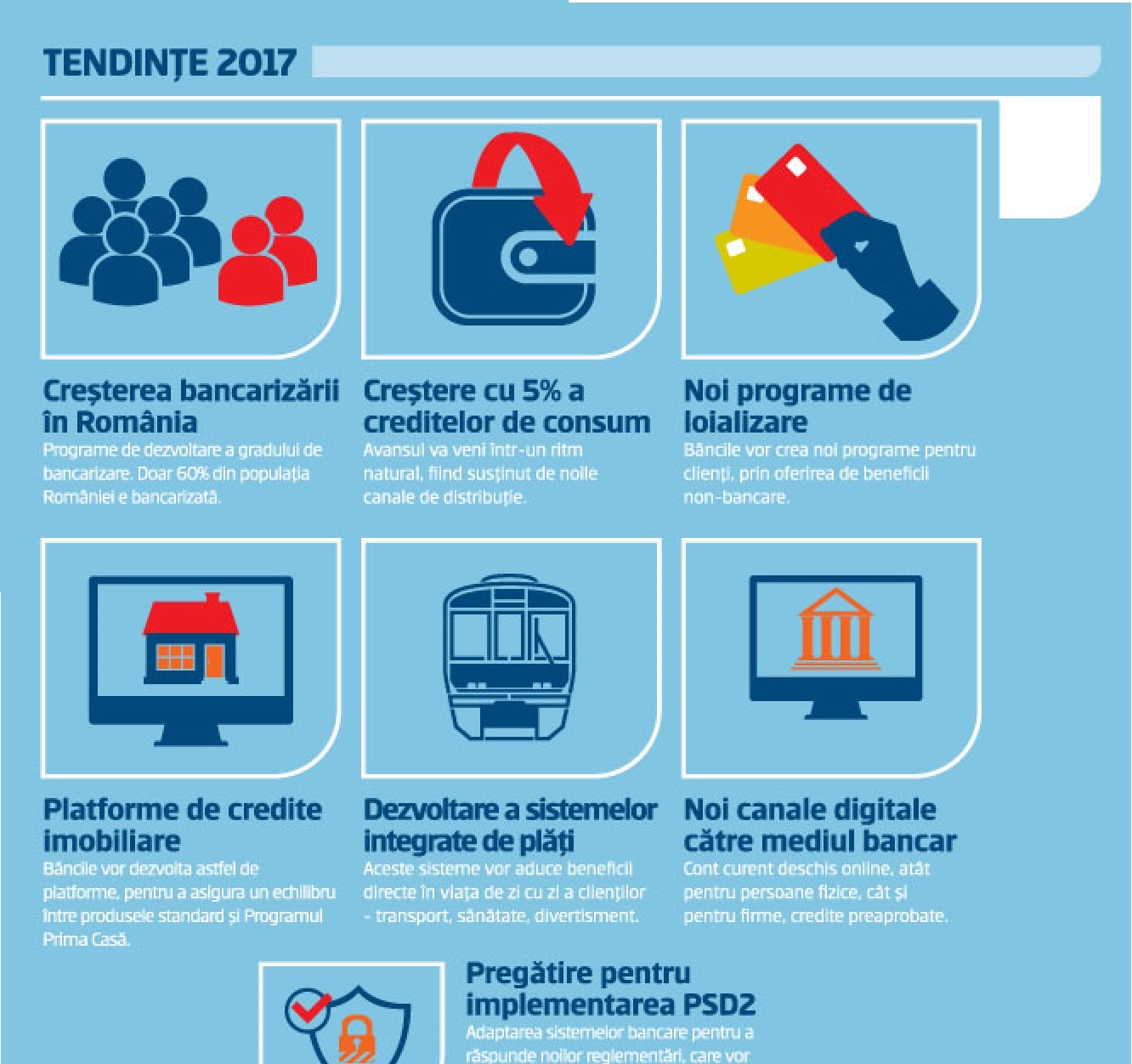 Sintetic, cele 5 tendinte ar fi urmatoarele: va creste gradul de bancarizare, creditele de consum vor avea o dinamica de 3-5%, vor fi dezvoltate noi canale digitale , sistemele integrate de plati se vor dezvolta si ar putea aparea o platforma de credite imobiliare care sa asigure un echilibru intre produsele standard de creditare si Prima Casa. Acestea sunt, in opinia vicepresedintelui executiv al BCR, Dana Demetrian, directiile spre care se va merge in 2017.