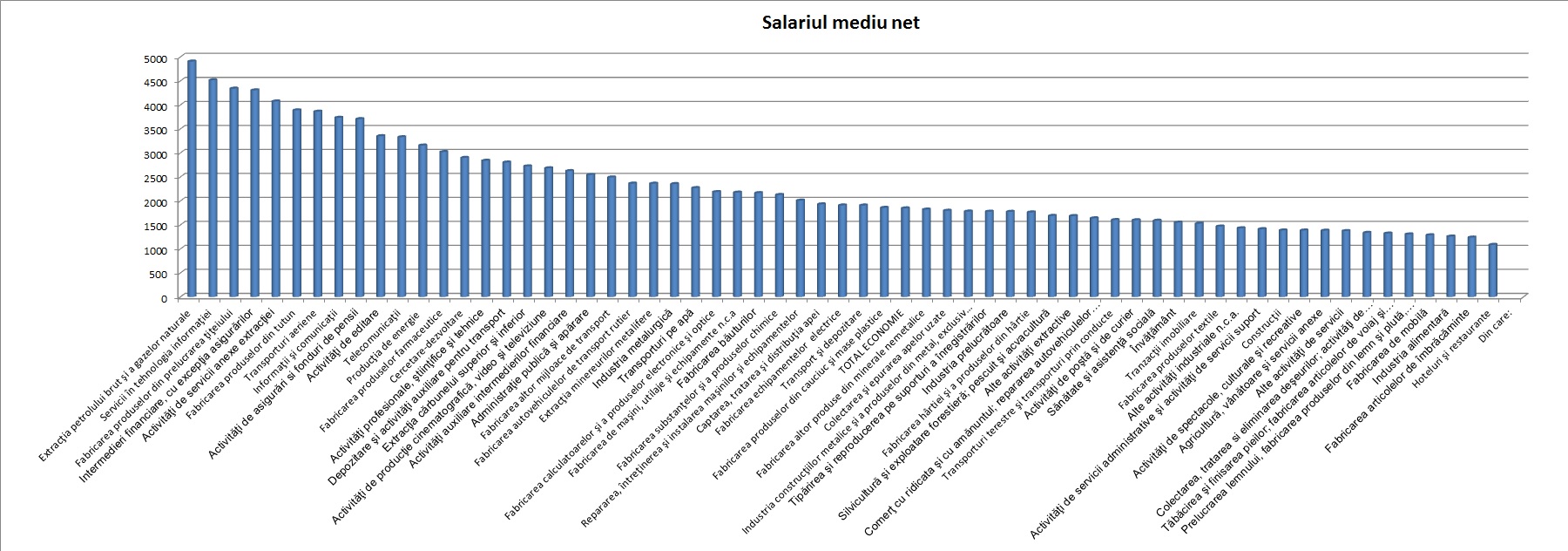 Salariul mediu net a fost in luna iulie de 1849 lei, mai mare cu 31 lei decat cel din iunie, potrivit datelor transmise luni de Institutul National de Statistica. Postasii sunt singura categorie de salariati care au luat mai putini bani in iulie (cu 18 lei) fata de salariul din ianuarie. Cele mai mari salarii s-au inregistrat in extractia petrolului brut si a gazelor naturale (4907 lei), iar cele mai mici in hoteluri si restaurante (1088 lei). In sectorul bugetar s-au inregistrat cresteri ale castigului salarial mediu net fata de luna precedenta astfel: administratie publica (2,2%), sanatate si asistenta sociala (1,3%), ca urmare a aplicarii prevederilor legale de la 1 iulie 2015 . In invatamant s-a inregistrat o scadere a castigului salarial mediu net (-3,4%) ca urmare a reducerii sumelor reprezentand plata cu ora a cadrelor didactice pe perioada vacantei scolare.