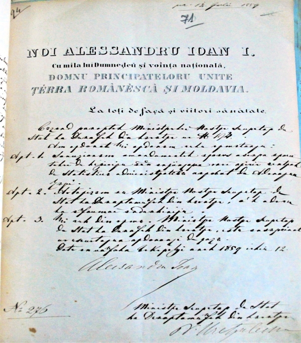 Însă, actul de naștere al statisticii oficiale românești îl reprezintă Ordonanța domnească semnată la 12 iulie 1859 de către domnitorul Alexandru Ioan Cuza prin care a fost înființat Oficiul Central de Statistică, una dintre primele instituții publice constituite după Unirea Principatelor Române de la 24 ianuarie 1859 și unul dintre cele mai vechi oficii statistice din Europa. Acesta este momentul marcat drept „Ziua Statisticianului” instituită prin H.G. 592/2002.