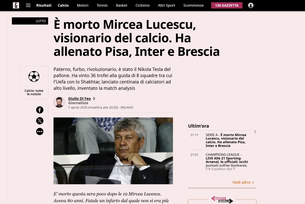 Cel mai important ziar de sport din Italia, cuvinte uriașe după moartea lui Mircea Lucescu: A murit vizionarul fotbalului Actualitate Ieri Cel mai important ziar de sport din Italia, cuvinte uriașe după moartea lui Mircea Lucescu: A murit vizionarul fotbalului