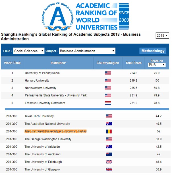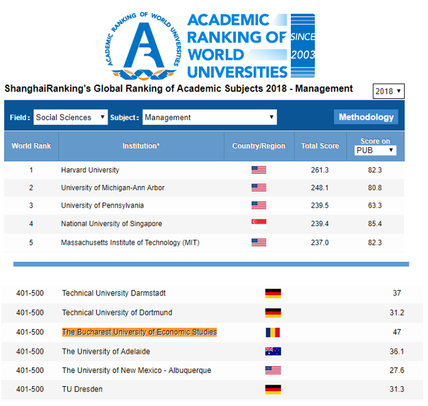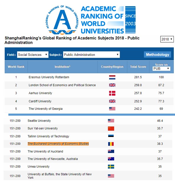În anul 2018, ASE a intrat în Top Shanghai cu încă trei domenii: Administrație publică (locul 151-200), Administrarea afacerilor (locul 201-300) și, respectiv, Management (locul 401-500).