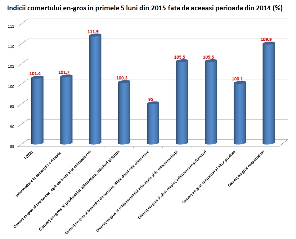 Cifra de afaceri din comertul cu ridicata (cu exceptia comertului cu autovehicule si motociclete), serie ajustata in functie de numarul de zile lucratoare si de sezonalitate, in perioada 1.I – 31.V.2015 comparativ cu perioada 1.I – 31.V.2014, in termeni nominali, a inregistrat o crestere cu 1,4% datorita cresterii comertului cu ridicata al produselor agricole brute si al animalelor vii (+11,9%), comertului cu ridicata nespecializat (+9,9%), comertului cu ridicata al altor masini, echipamente si furnituri (+5,5%), comertului cu ridicata al echipamentului informatic si de telecomunicatii (+5,5%), activitatilor de intermediere in comertul cu ridicata (+1,7%), comertului cu ridicata al produselor alimentare, al bauturilor si al tutunului (+0,3%) si comertului cu ridicata specializat al altor produse (+0,1%). Comertul cu ridicata al bunurilor de consum, altele decat cele alimentare a scazut cu 5,0%.