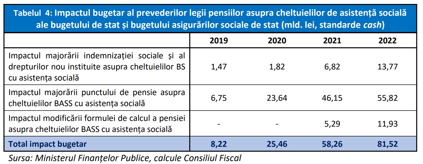 “Un element de natură să complice major construcția bugetară pe termen mediu este reprezentat de impactul Legii 127/2019 privind sistemul public de pensii. Chiar dacă majoritatea prevederilor acesteia intră în vigoare la 1 septembrie 2021, până la acel moment sunt prevăzute majorări etapizate importante ale punctului de pensie, de la 1100 de lei în prezent, la 1875 de lei începând cu 1 septembrie 2021”, se arată într-un raport al Consiliului Fiscal.