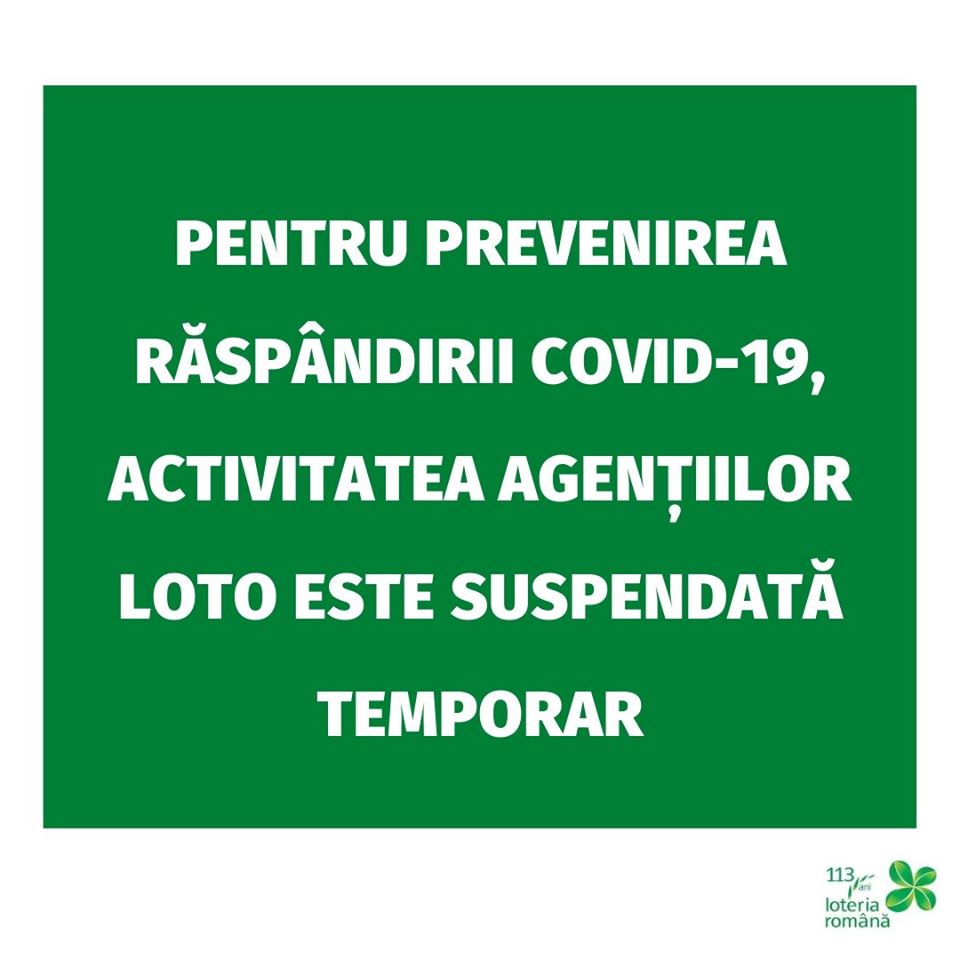 ”Începând de astăzi, 18.03.2020, este suspendată temporar activitatea de comercializare a produselor loteristice, loz, loto, videoloterie și pariuri mutuale, până la o dată ce va fi comunicată ulterior. Prin urmare, începând de astăzi, agențiile LOTO sunt închise”, potrivit unui comunicat de la Loteria Română.