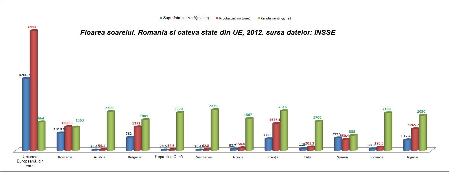 In anul 2012 productia agricola vegetala din tara noastra a inregistrat scaderi la toate culturile cu exceptia sfeclei de zahar, se arata in cercetarea statistica „Productia agricola vegetala la principalele culturi, in anul 2012”. Partea proasta este ca Romania inregistreaza in continuare princtre cele mai mici randamente la hectar din UE. La floarea soarelui de pilda, desi din punct de vedere al suprafetei cultivate in 2012, Romania s-a situat pe primul loc in randul Statelor Membre, randamentul ne plaseaza pe penultimul loc in UE. Drept este ca piata neagra influenteaza uneori productia mica raportata, dar problema productivitatii scazute mai are explicatia in lipsa irigatiilor si in vremea neprielnica.