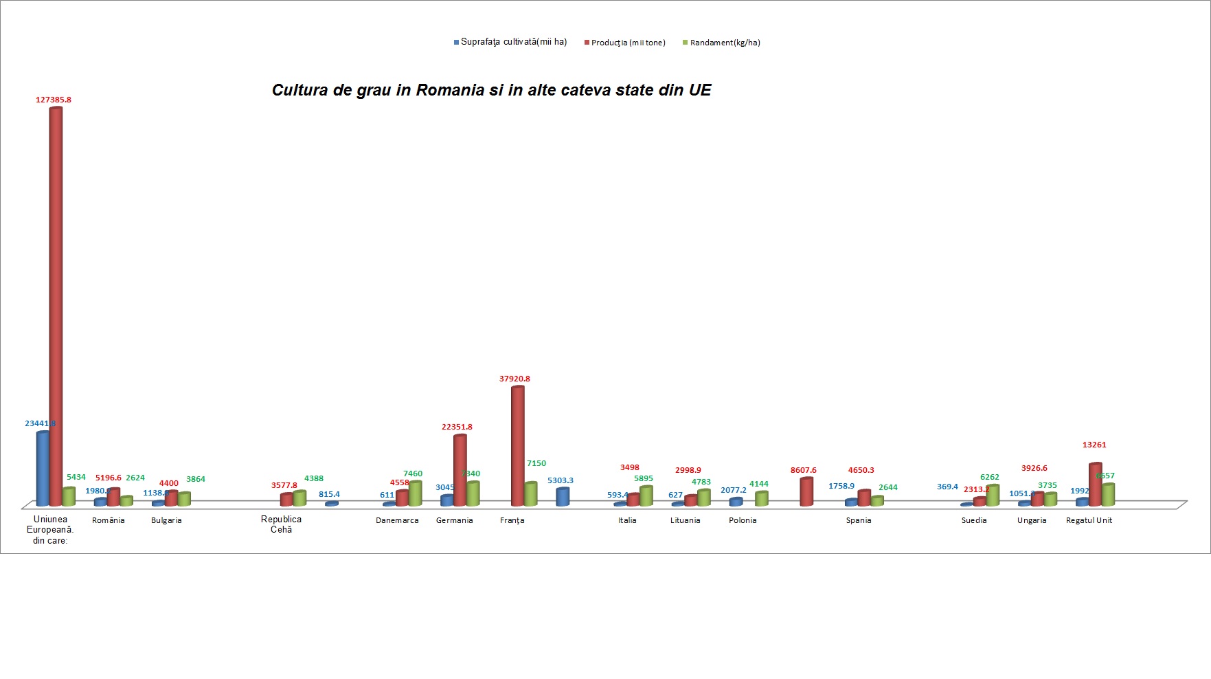 In anul 2012, Romania s-a situat, pe locul cinci in randul Statelor Membre, atat din punct de vedere al suprafetei cultivate, cat si al productiei obtinute la grau comun si pe ultimul loc din punct de vedere al randamentului.