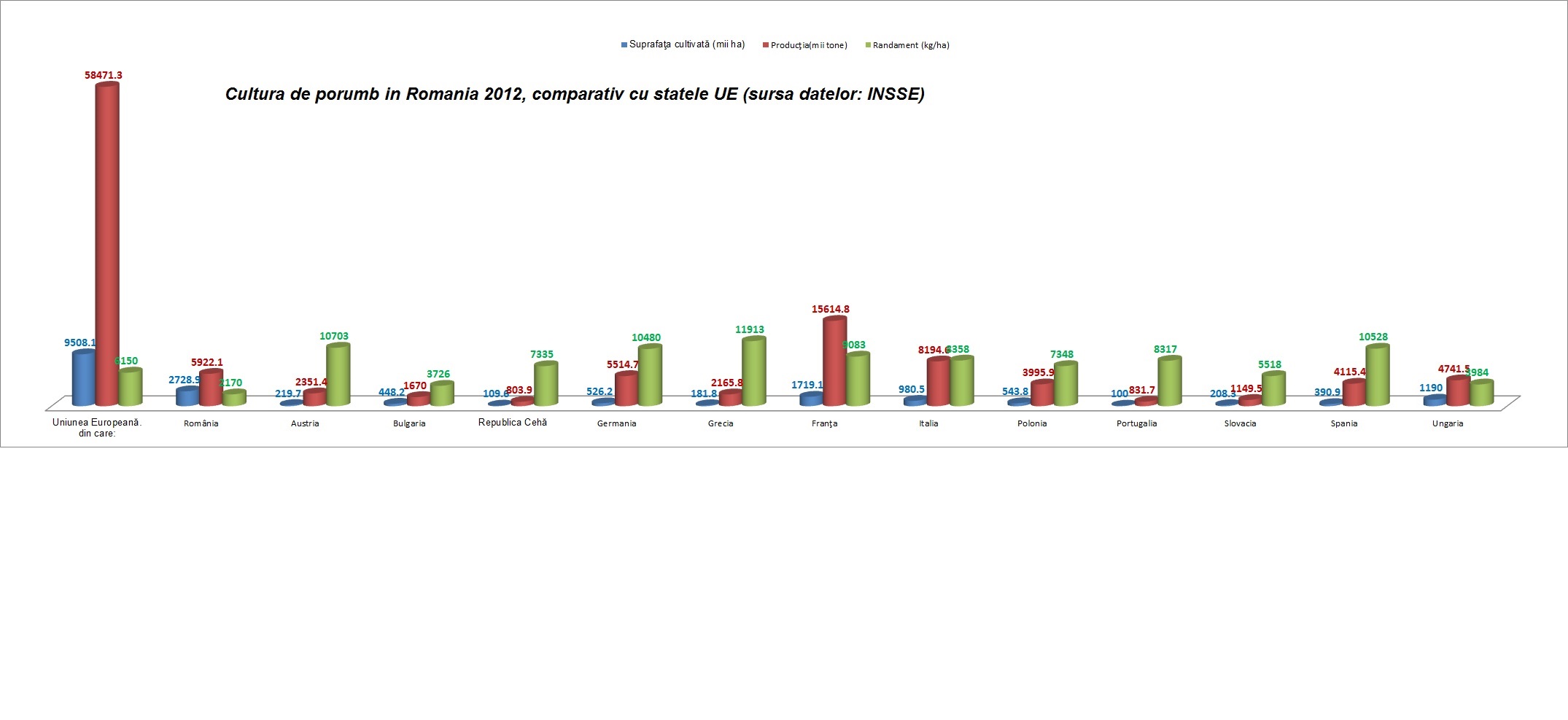 Romania s-a situat pe primul loc dupa suprafata cultivata cu porumb, din Uniunea Europeana, iar la productie s-a situat pe locul trei, dupa Franta si Italia, datorita unui randament inferior. Dealtfel randamentul la porumb realizat de Romania este mai mic decat al celorlalte State Membre.