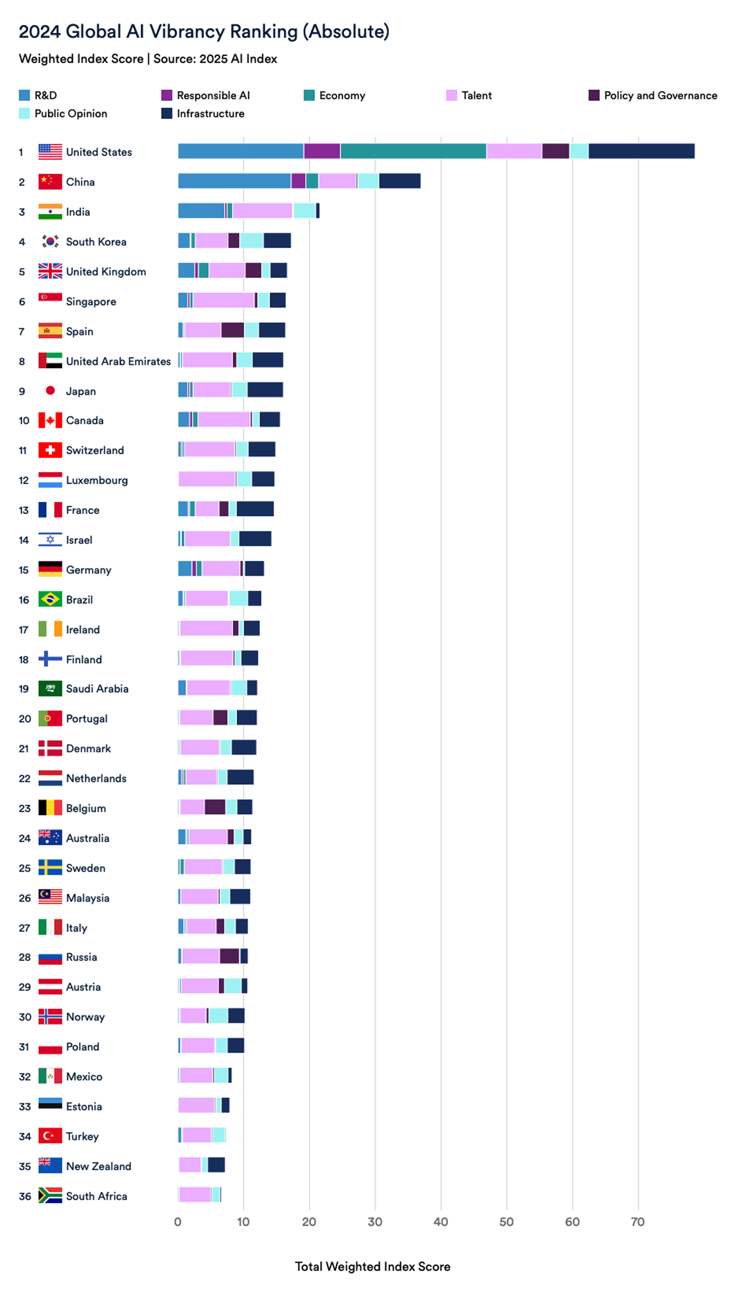 Există un clasament global al dinamismului Inteligenței Artificiale (Global AI Vibrancy Ranking). Ierarhia pornește de la un raport extrem de complex al Universității Stanford, la care s-au adăugat și alte criterii. În total, țările sunt ierarhizate, în materie de dezvoltare AI, după 42 de indicatori.