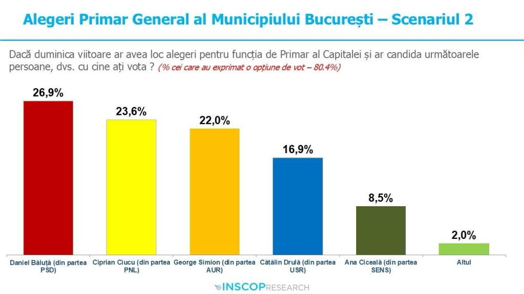 Scenariul 2 – din partea AUR candidează George Simion. Daniel Băluță este tot pe prima poziție, cu un scor de 26,9%, dintre cei 80,4% dintre respondenți care au exprimat o opțiune de vot. În spatele lui se află Ciprian Ciucu, cu 23,6%, urmat de George Simion, cu 22%, Cătălin Drulă, cu 16,9% și Ana Ciceală, cu 8,5%.