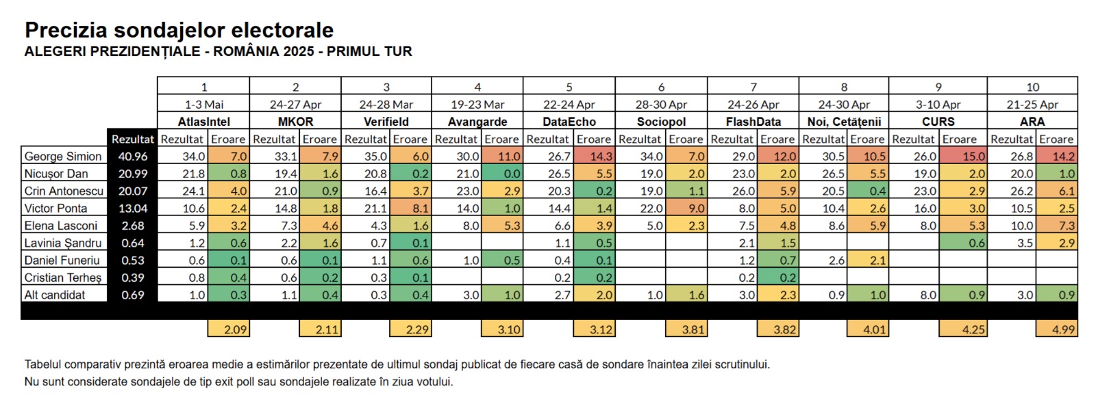 George Simion a obținut la turul din 4 mai 41% din voturi. Din sondajele de opinie relevante, apărute înainte de alegeri, niciunul nu s-a apropiat în estimări de performanța președintelui AUR. Cea mai mică eroare a fost de 6 puncte procentuale în minus, în timp ce alte sondaje l-au subestimat pe Simion cu 14-15 puncte procentuale.