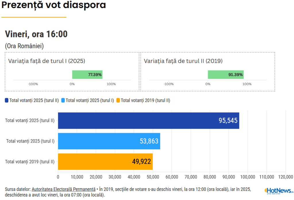 Până la această oră, în diaspora votaseră cu peste 9.400 de români mai mulți decât în primul tur al scrutinului prezidențial. Creșterea este cu peste 56% comparativ cu primul tur.
