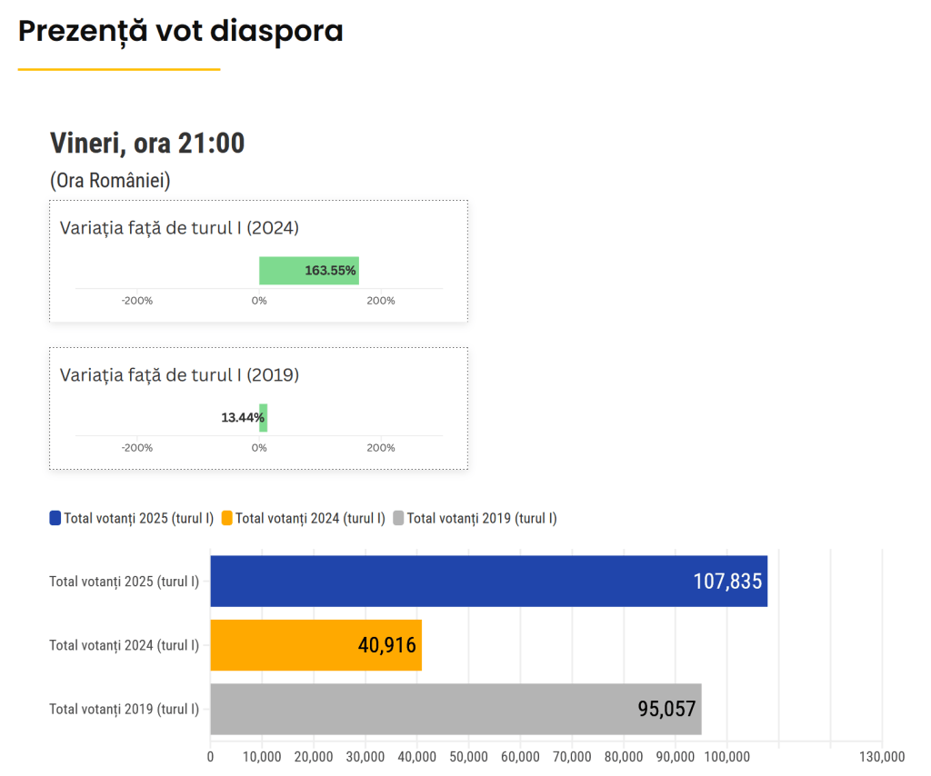 Numărul alegătorilor români din afara țării care s-au prezentat la urne pentru turul întâi al alegerilor prezidențiale 2025 a depășit pragul de 100.000, vineri seară, în prima zi a programului de vot în diaspora. Spre comparație, la turul întâi al prezidențialelor desfășurat în noiembrie 2024 votaseră până la aceeași oră un număr de până la 41.000 de alegători. Atunci, însă, secțiile de vot s-au deschis cu cinci ore mai târziu.
