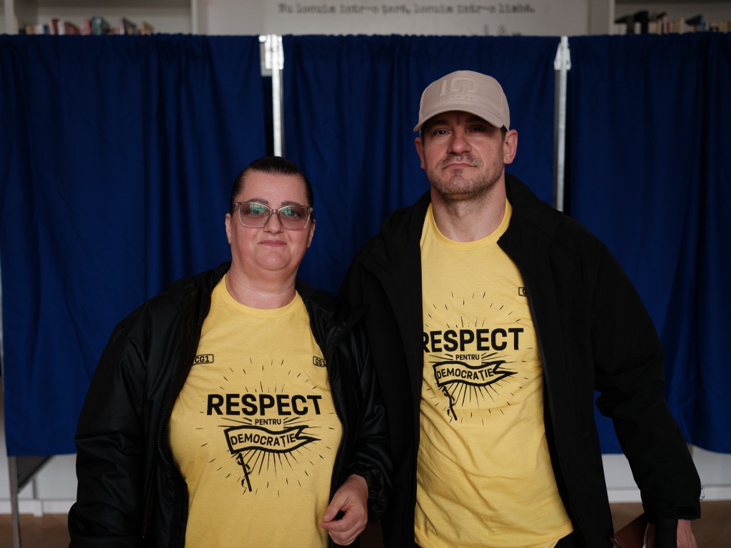 Simona Iosub, 47 de ani, a venit să voteze la secția 19 de la Institutul Cultural Român din Viena, împreună cu partenerul ei, George Marinescu, 39 de ani. Amândoi poartă tricouri inscripționate cu mesajul „Respect pentru democrație”, pe care le-au primit acum două săptămâni de la George Simion, în timpul unei întâlniri cu românii din Austria.