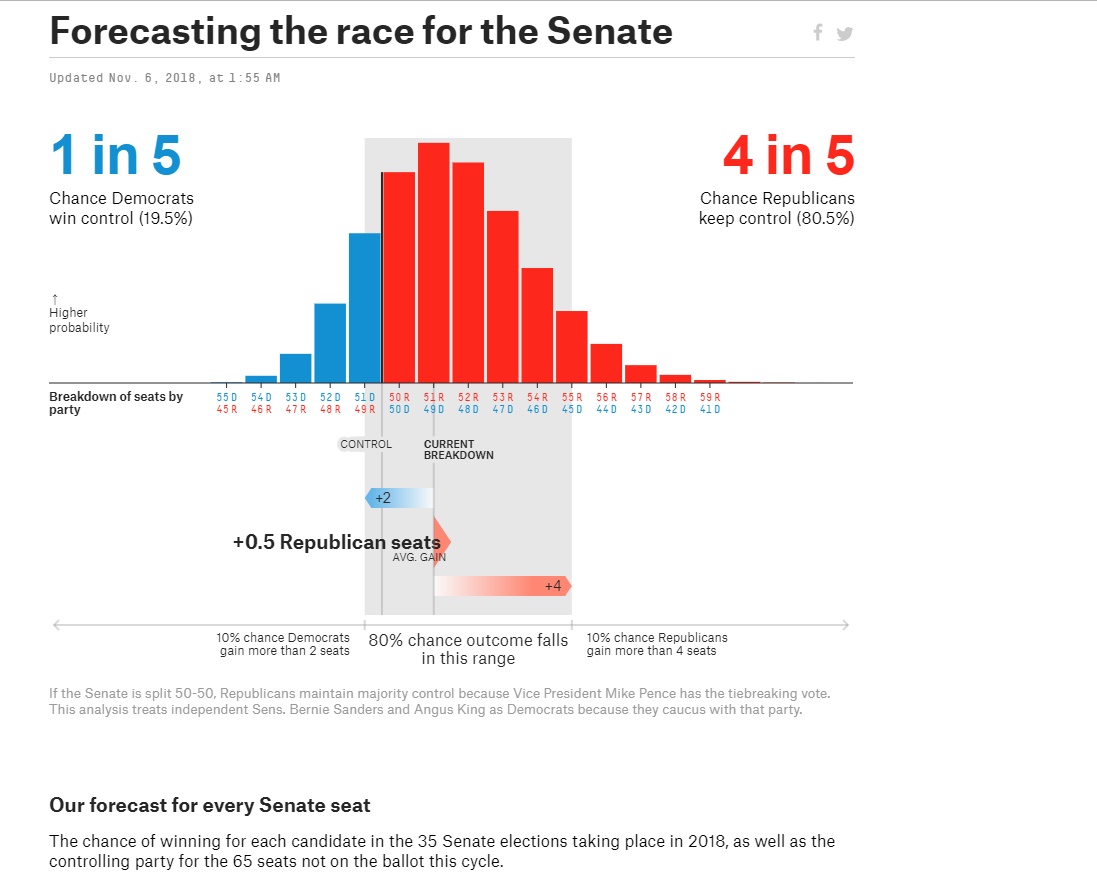 În Senat, care e alcătuit din 100 de aleși (doi pentru fiecare stat), o treime dintre mandate sunt reînnoite la fiecare doi ani, iar anul acesta 35 de locuri sunt în joc. Republicanii au o majoritate strânsă (51-49). Însă harta electorală a camerei superioare este mult mai defavorabilă democraților, întrucât aceștia trebuie să își apere 26 de locuri – iar șase dintre acestea sunt amenințate – față de doar nouă republicanii. Senatorii sunt aleși pentru șase ani și își vor începe de asemenea mandatul la începutul lui ianuarie.