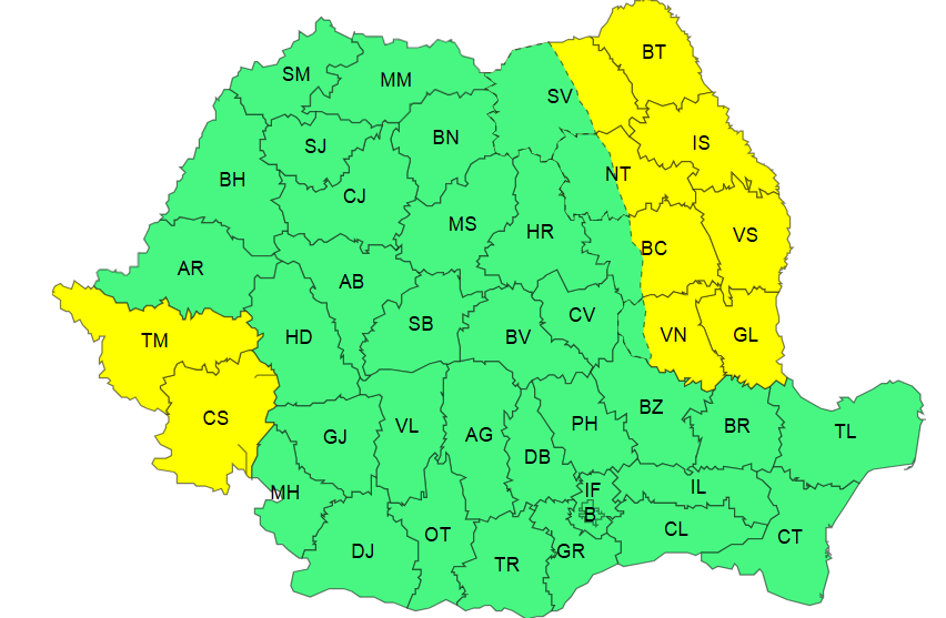 Potrivit ANM, în intervalul 14 aprilie, ora 10:00 – 16 aprilie, ora 10:00, în judeţele Bacău, Botoşani, Caraş-Severin, Galaţi, Iaşi, Neamţ, Suceava, Timiş, Vrancea şi Vaslui, temporar, vântul va avea intensificări cu rafale de 50 – 60 km/h, care vor ajunge şi la 75 – 90 km/h.