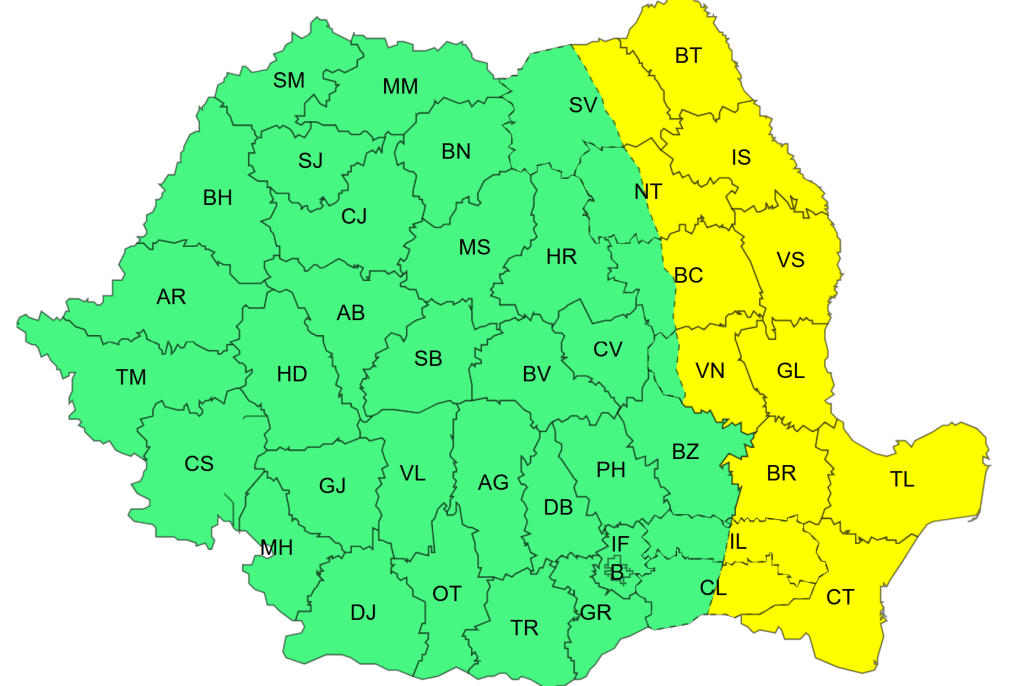 Meteorologii au emis o atenţionare cod galben de vânt puternic valabilă în mai multe județe din estul țării pentru ziua de joi. În același timp, astăzi, judeţele Mehedinţi şi Dolj se află sub alertă de vânt puternic, cu rafale ce vor atinge 50-70 de kilometri pe oră.