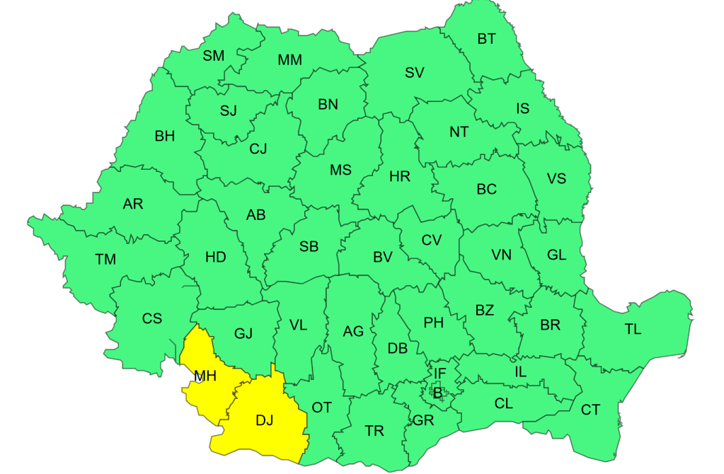 ANM a emis o atenţionare cod galben privind intensificări ale vântului, valabilă miercuri, între orele 12.00 şi 21.00, în judeţele Mehedinţi şi Dolj. Aici vântul va avea intensificări cu viteze la rafală de 50…70 km/h.