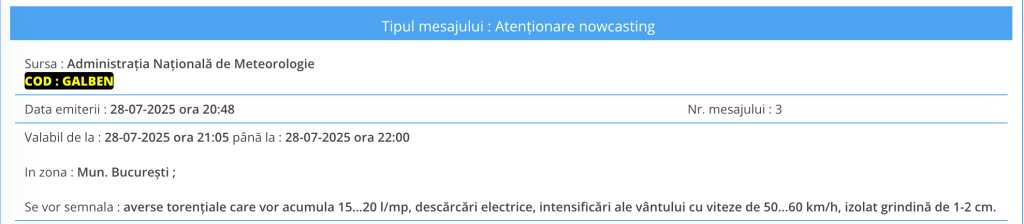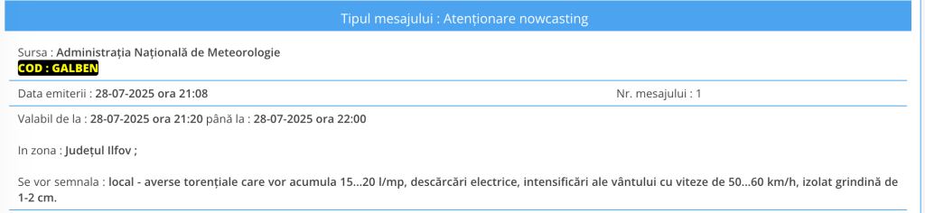 Două coduri galbene de averse torențiale, descărcări electrice, intensificări ale vântului și grindină au fost transmise puțin după ora 21:00, de către ANM, pentru Capitală și județul Ilfov.