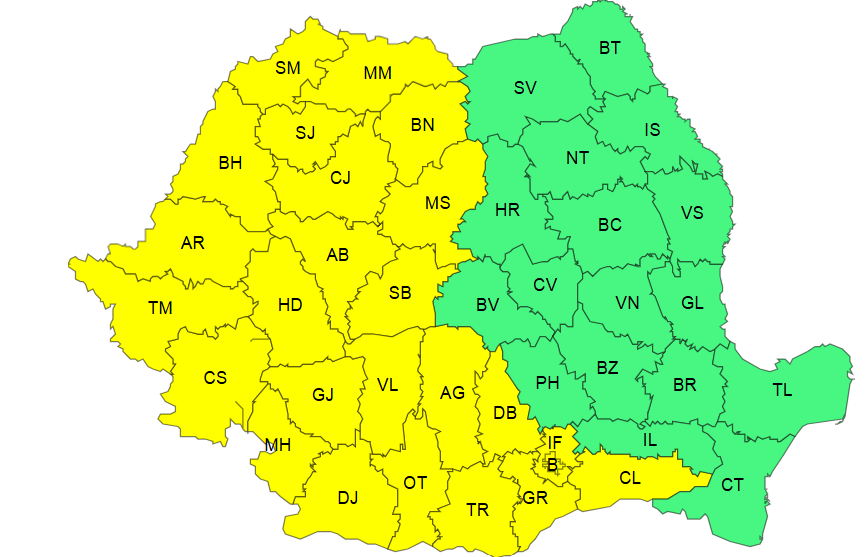 Astăzi, până la ora 21.00, se află sub cod galben de caniculă județe din Maramureș, Crișana, Banat, Oltenia, cea mai mare parte a Transilvaniei, precum și vestul, centrul și sudul Munteniei.