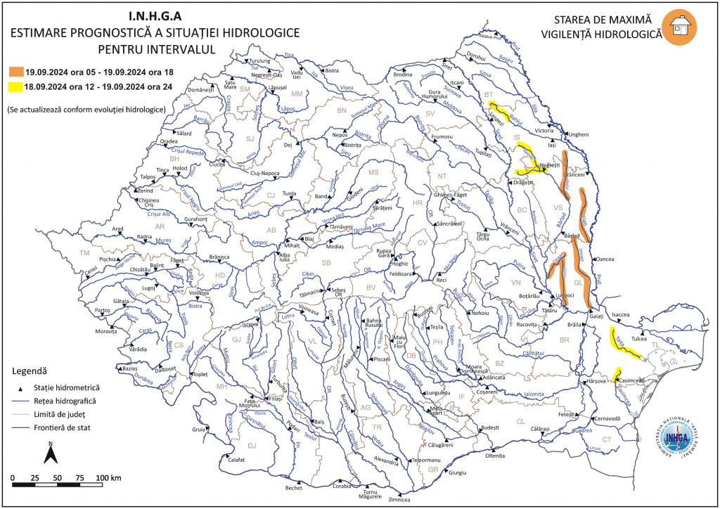 Institutul Național de Hidrologie și Gospodărire a Apelor a emis coduri galbene și portocalii care vizează scurgeri importante pe versanţi, torenţi şi pâraie, viituri rapide pe râurile mici cu posibile efecte de inundaţii locale şi creşteri de debite şi niveluri pe unele râuri din bazinele hidrografice menţionate, cu posibile depăşiri ale cotelor de apărare.