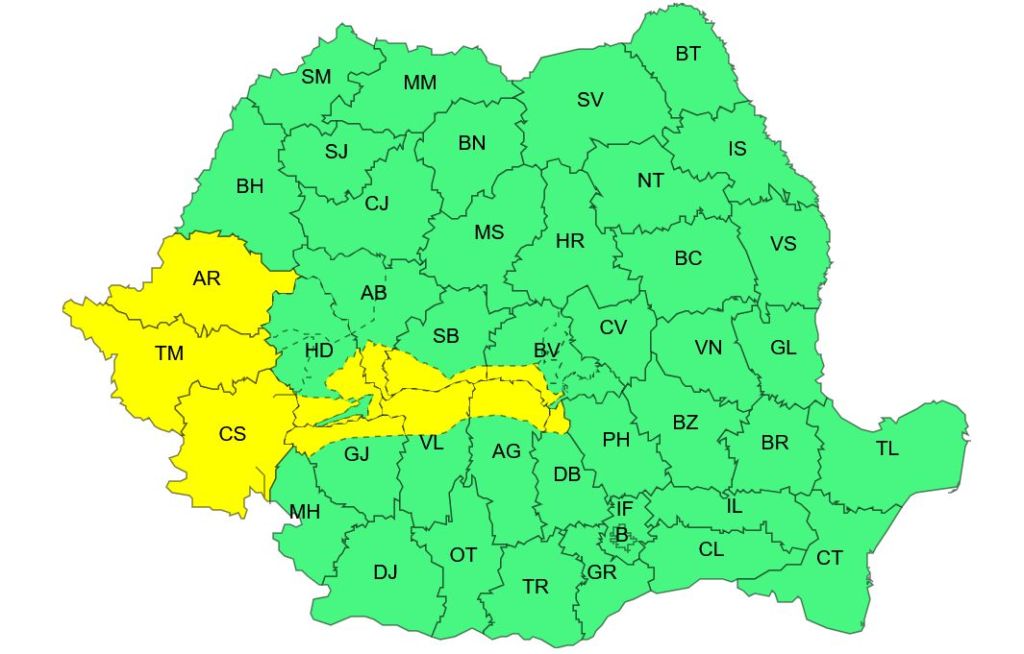Un cod galben de vânt puternic a fost emis pentru intervalul 25 ianuarie, ora 14:00 – 26 ianuarie, ora 08:00. Avertizarea meteo vizează zonele marcate pe harta ANM din Banat, sudul Crișanei și Carpații Meridionali, unde vor fi intensificări ale vântului cu viteze de 50…70 km/h, iar la altitudini în general de peste 1700 m rafalele vor depăși 90…100 km/h.