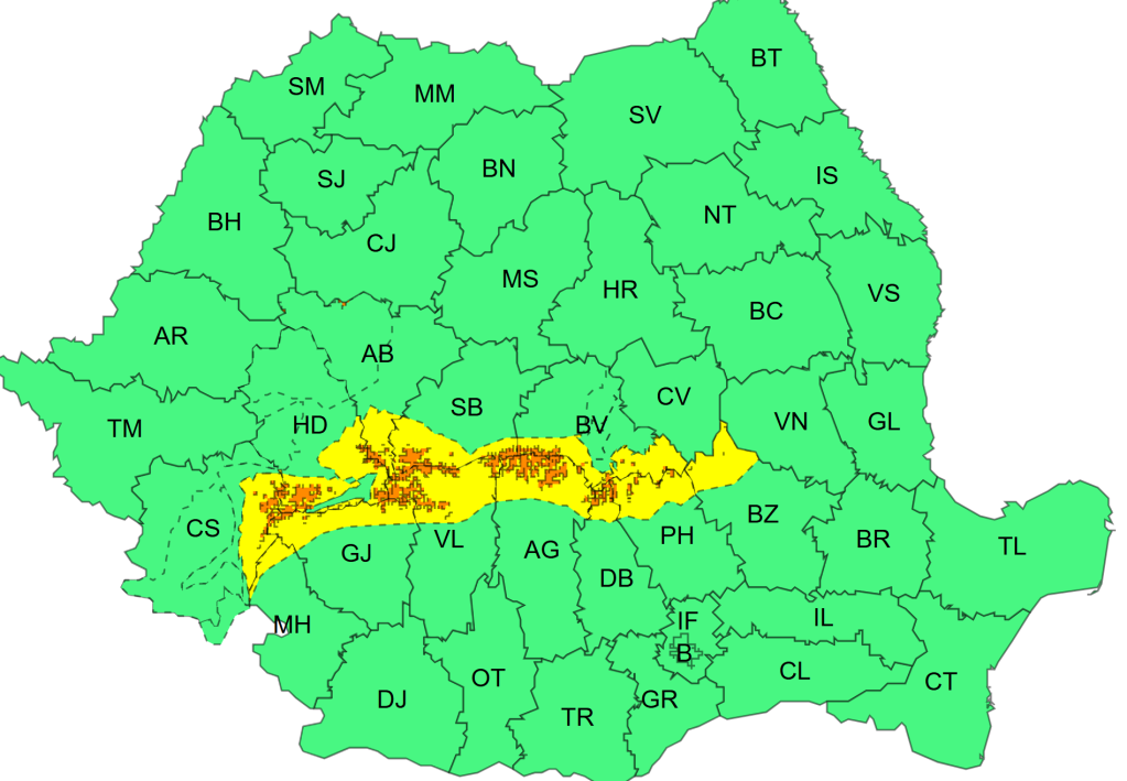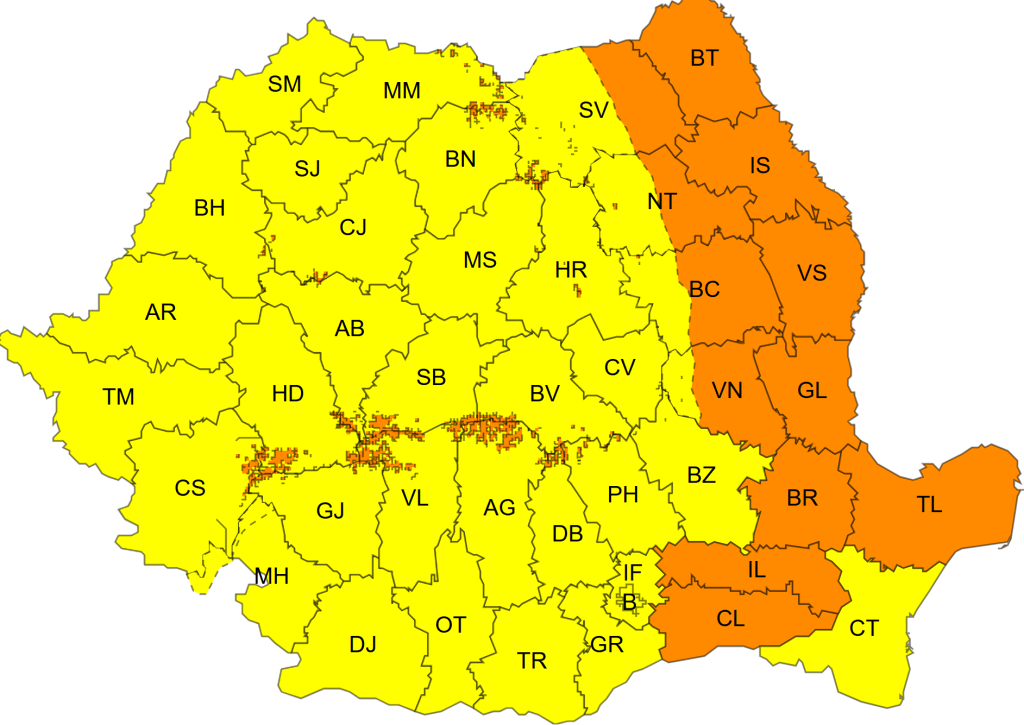 În același interval, este cod portocaliu în Carpații Meridionali, la altitudini mai mari de 1600 m, unde vor fi intensificări puternice ale vântului, cu viteze la rafală de 100…120 km/h.