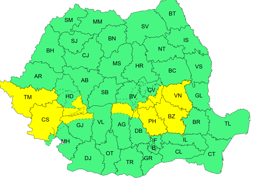 De asemenea, este cod galben de vânt puternic, până diseară, la ora 20.00, în județul Caraș-Severin și local în județul Timiș. Aici, vântul va avea intensificări cu viteze de 50…70 km/h, iar în Munții Banatului și în zona înaltă din vestul Carpaților Meridionali, rafalele vor atinge 90…100 km/h, viscolind zăpada depusă.