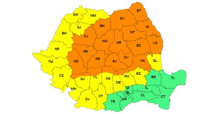 Conform Administrației Naționale de Meteorologie (ANM), vineri, în intervalul orar 12:00 – 19:00, va fi Cod portocaliu de instabilitate atmosferică accentuată în cea mai mare parte a Transilvaniei și Moldovei, precum și la munte, unde se vor semnala vijelii puternice (viteze ale vântului de 70- 90 km/h), grindină de medii și mari dimensiuni, frecvente descărcări electrice și averse torențiale. În intervale scurte de timp (între o oră și trei ore), cantitățile de apă vor fi de 25 – 40 l/mp, iar pe arii restrânse vor depăși 50 l/mp.