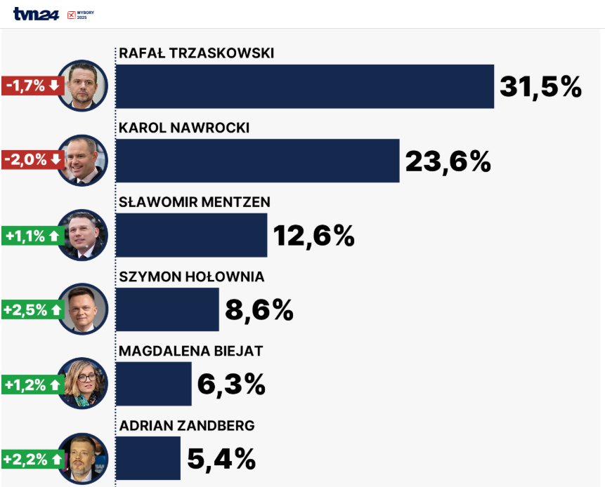 Un sondaj de opinie realizat de organizația IBRIS arată că Trzaskowski îl devansează pe Nawrocki cu 31,5% la 23,6% înaintea primului tur de scrutin.