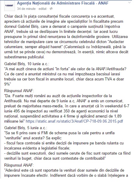„Chiar daca in piata consultantei fiscale concurenta s-a accentuat, apreciem ca actiunile de imagine ale specialistilor in fiscalitate precum domnul Gabriel Biris, care a demarat o campanie sustinuta impotriva ANAF, trebuie sa se desfasoare in limitele decentei”, scriu reprezentantii ANAF pe pagina de Facebook. „Iar acest lucru presupune in primul rand renuntarea la dezinformarile grosiere. Utilizarea tehnicilor de manipulare care se circumscriu celebrului dicton „Audacter calumniare, semper aliquid haeret” (Calomniaza cu indrazneala, pana la urma tot se prinde ceva) nu demonstreaza, in esenta, nimic altceva decat subestimarea publicului.