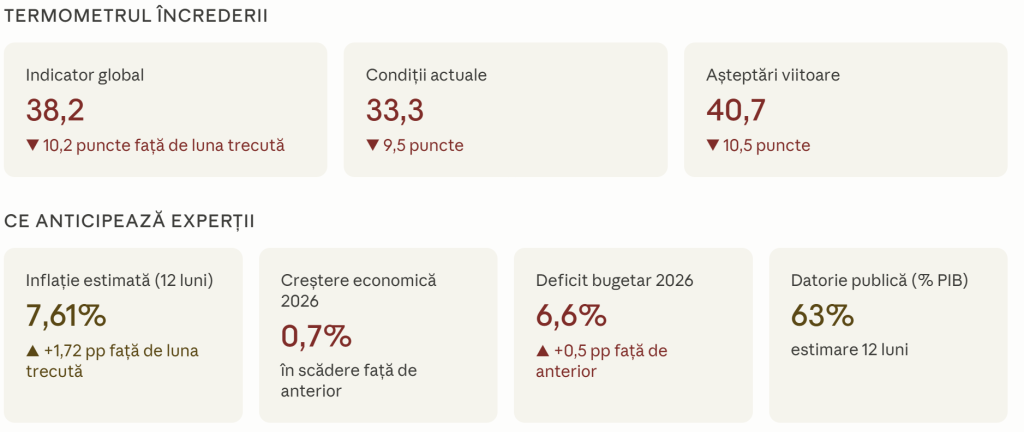 În fiecare lună, asociația întreabă membrii săi cum văd ei economia. Răspunsurile din martie 2026 sunt îngrijorătoare: încrederea în economie a scăzut brusc, ajungând la 38,2 din 100. Cu cât scorul e mai mic, cu atât lucrurile arată mai rău.