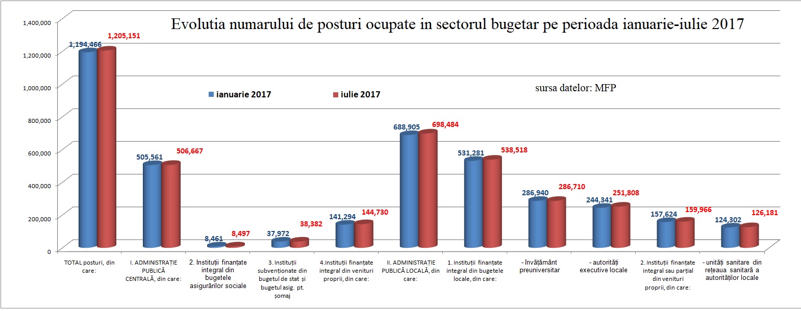 Daca ne uitam defalcat pe institutii, o sa observam o crestere a salariatilor la aproape toate institutiile, de la Administratia Prezidentiala (6 posturi noi), Camera Deputatilor (13 posturi noi), Inalta Curte de Casatie si Justitie (6 noi angajati), Consiliul Concurentei (7 posturi noi), Ministerul Agriculturii (237 posturi noi), dar „grosul” noilor angajari s-au facut in administratia publica locala- aproape 7500 de posturi.