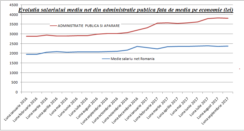 Iar mai jos, vedeti cresterea salariala din administratia publica vs cresterea salariului mediu net din Romania in perioada ianuarie 2016-septembrie 2017: