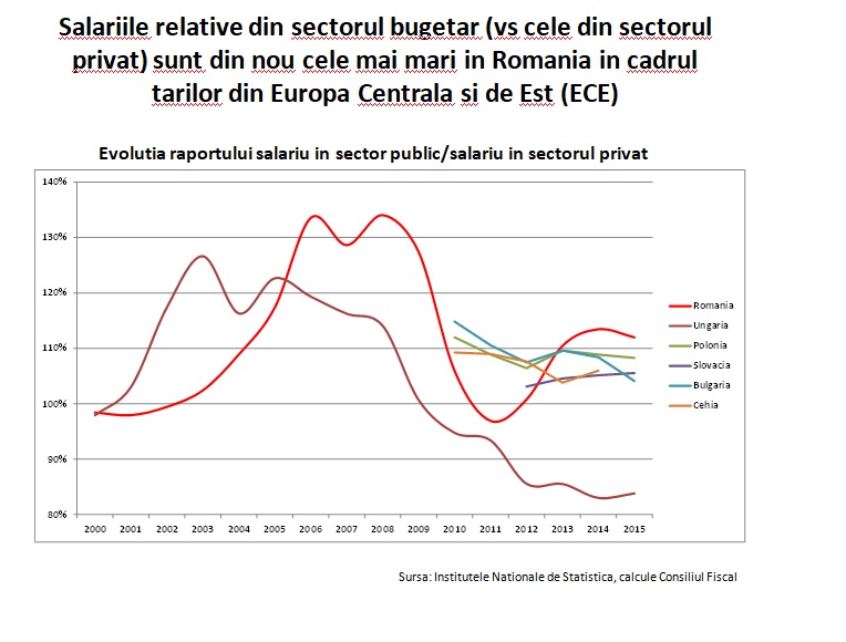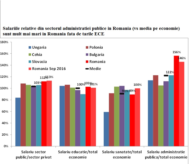 Acum, avem cele mai mari salarii publice in Europa Centrala si de Est, ca raport al salariului din administratia publicafata de salariul mediu din economie. In Educatie suntem pe media europeana din acest punct de vedere iar in Sanatate suntem sub medie.