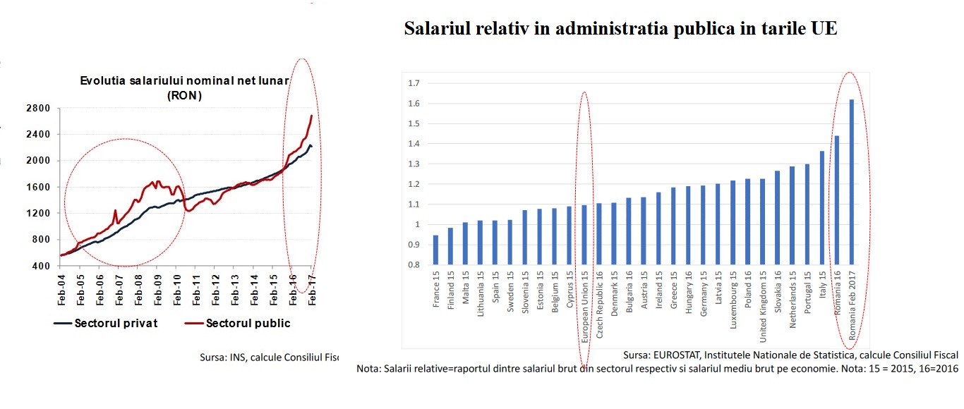 Mai jos, aveti evolutia salariului din sectorul public si cel privat, dar si o comparatie a salariiilor relative din administratia publica in tar statele europene. Salariul relativ se calculeaza ca raport dintre salariul brut dintr-un anumit sector (in cazul nostru, administratia publica) si salariul brut mediu pe economie.
