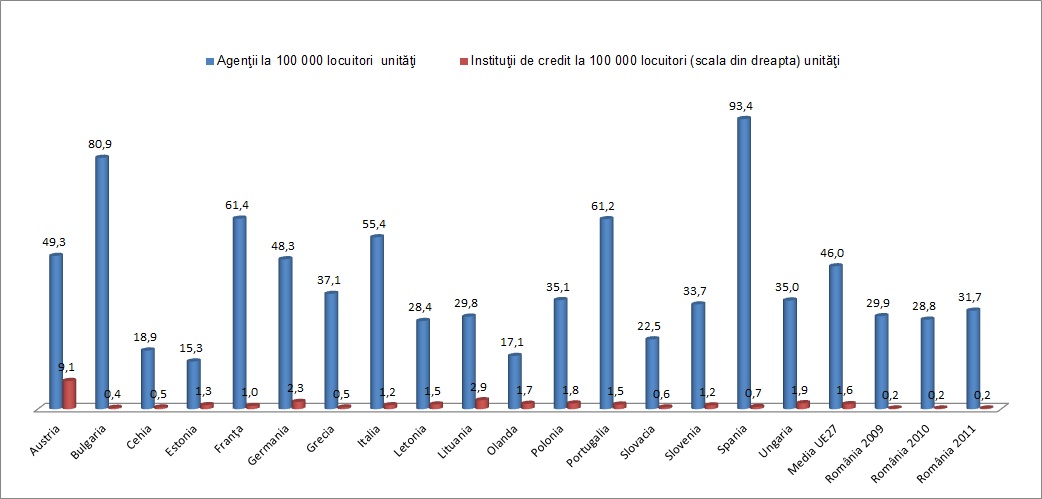 Mai sus aveti indicatorul de care va povesteam in primele randuri. Agentii la suta de mii de locuitori. E mai putin relevant din cauza datelor de la Recensamant, dar va puteti face o imagine cam pe unde ne situam fata de restul Uniunii Europene.Departe. Acest indicator reflecta si usurinta relatiei client-banca. Intrucat in perioada urmatoare e de asteptat sa se inchida si alte agentii bancare, indicatorul s-ar putea diminua.