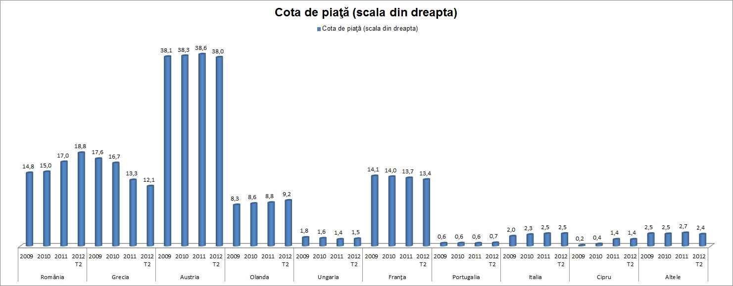 Legat de finantarile din afara si de capacitatea de a se reinventa pe piata, bancile si-au vazut schimbate si cotele de piata. Desi in titlu scrie ca afisam cota de piata pe scala din dreapta, pentru usurinta am trecut-o desupra barelor din grafic. Prea multe nu avem ce comenta, dar daca faceti un grafic care sa lege reducerea expunerilor pe Romania si a cotei de piata veti vedea elasticitatea ridicata a acestui indicator din urma.