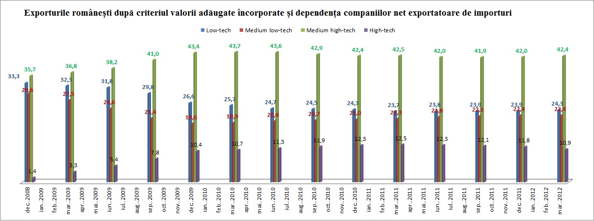 Grupa High-Tech este sustinuta de majorarea exporturilor de calculatoare si produse electronice si optice si a celor de produse farmaceutice de baza si preparate farmaceutice. Medium-high-tech-ul este sustinut in anul 2012, in principal, de subsectorul – autovehicule de transport rutier, remorci si semiremorci si de industria prelucratoare. Low tech-ul e reprezentat de exporturile de alimente si textle. Din pacate, exportam tot mai putine produse cu valoare adaugata ridicata.