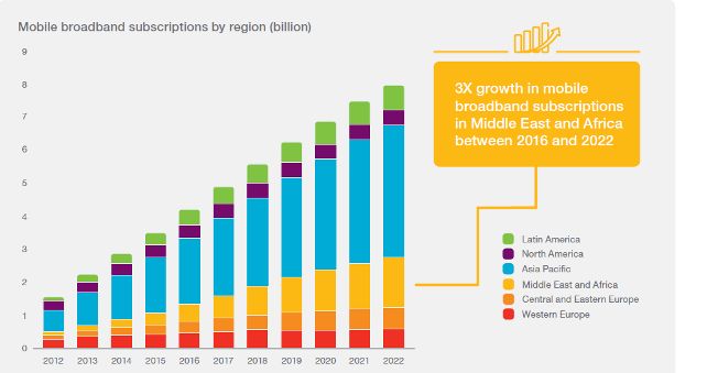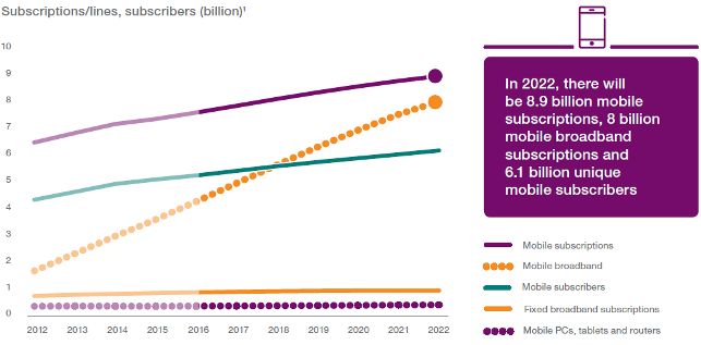 In 15 noiembrie 2016 a fost publicat Ericsson Mobility Report o analiza a evolutiei pana in anul 2022 a utilizarii comunicatiilor mobile la nivel mondial, cand vor fi 8,9 miliarde linii, folosite de circa 6,1 miliarde de oameni. Potrivit raportului utilizarea tehnologiei GSM va continua scaderea, in timp ce utilizarea tehnologiei 3G va creste usor. Cea mai mare crestere o va inregistra utilizarea tehnologiei LTE, ultima lansata comercial in 2009, circa 4,6 miliarde, reprezenand 52% din total.