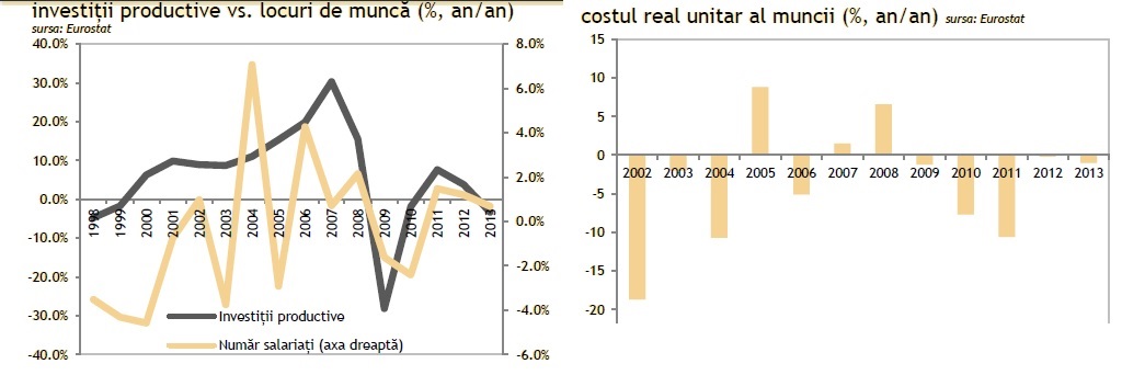 Conform analizei elaborate, in Romania investitiile productive au crescut cu un ritm mediu anual de 5.3%, in timp ce numarul de locuri de munca a scazut cu o rata medie anuala de 0.4%, in perioada 1997-2013. Evolutia reflecta ca impactul restructurarii companiilor publice si al migratiei a fost mai puternic decat intrarile masive de capital strain (pana la debutul crizei). In Zona Euro si Statele Unite relatia intre cele doua variabile este normala/directa, chiar daca se noteaza diferente importante. In Zona Euro investitiile au crescut cu un ritm mediu anual de 0.7%, iar locurile de munca cu 1% in perioada 1997-2013. Spre deosebire, in Statele Unite dinamica medie anuala a investitiilor a fost mai puternica decat cea a locurilor de munca (3% vs. 0.6%) in acest interval de timp.