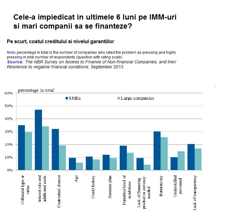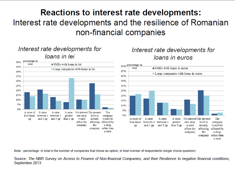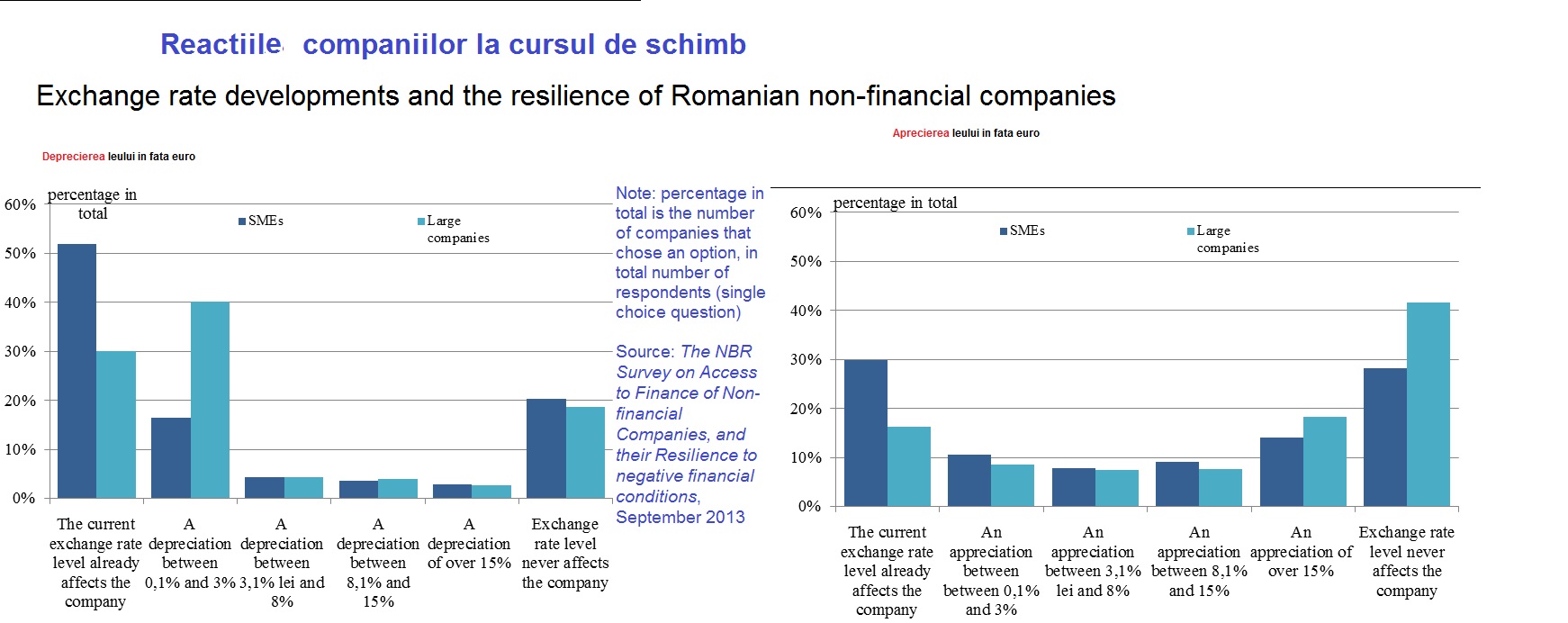 Un sondaj prezentat saptamana trecuta undeva inafara Capitalei de catre inalti oficiali ai Bancii Nationale colegilor lor din cadrul FMI a facut o radiografie a mediului de afaceri local la finalul acestui an. De ce anume se plang companiile romanesti, care e reactia lor la variatiile cursului leu/euro, ce probleme au atunci cand vor sa se finanteze samd. Rezultatele au fost prezentate in urma cu cateva zile expertilor FMI, care urmeaza sa discute pe marginea rezultatelor sondajului cu sefii Finantelor. Click pe grafice pentru detalii.