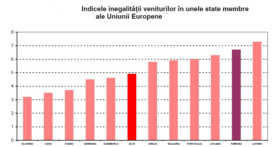 In Romania inegalitatea veniturilor este sensibil superioara mediei pe ansamblul Uniunii Europeane. In anul 2009 cei mai bogati 20% dintre cetatenii Uniunii Europene au realizat venituri de 4,9 ori mai mari decat cei mai saraci 20%. Cele mai mici ecarturi intre veniturile persoanelor bogate si cele sarace s-au inregistrat in anul 2009 in Slovenia (3,2), Ungaria si Cehia (3,5), Slovacia (3,6), Austria, Finlanda si Suedia (3,7), iar cele mai mari in Letonia (7,3), Romania (6,7) si Lituania (6,3). Statele care au valori reduse ale indicelui inegalitatii veniturilor prezinta si rate de saracie mult inferioare mediei europene. Nivelul mediu pe Uniunea Europeana al indicelui ingalitatii veniturilor a fost depasit in 11 state, inclusiv Romania.