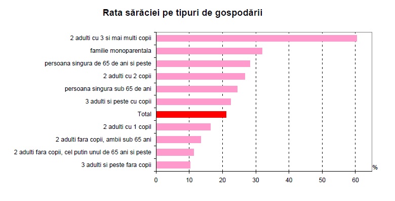 In gospodariile cu copii, situatia cea mai dificila se intalneste in cazul persoanelor din gospodariile numeroase (formate din 2 adulti si 3 sau mai multi copii), dintre care 60,4% se afla in risc de saracie, precum si la persoanele din familii monoparentale (1 adult cu cel putin un copil dependent), pentru care s-a inregistrat in anul 2010 o rata de saracie de 31,9%. In comparatie cu