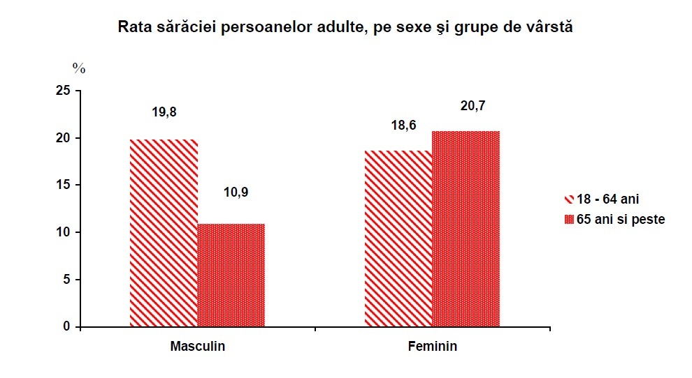 Daca in cazul persoanelor adulte, in varsta de 18 – 64 ani, diferentierile intre femei si barbati sunt relativ „stranse”, la varstnicii de 65 de ani si peste deosebirile sunt foarte pronuntate, femeile fiind mult mai afectate de saracie decat barbatii. Astfel, rata saraciei aferenta femeilor este de 20,7%, iar cea a barbatilor de numai 10,9%. Sub efectul ratei mai reduse a barbatilor varstnici, rata grupei de varsta 65 ani si peste ajunge la 16,7%, nivel inferior mediei pe ansamblul populatiei